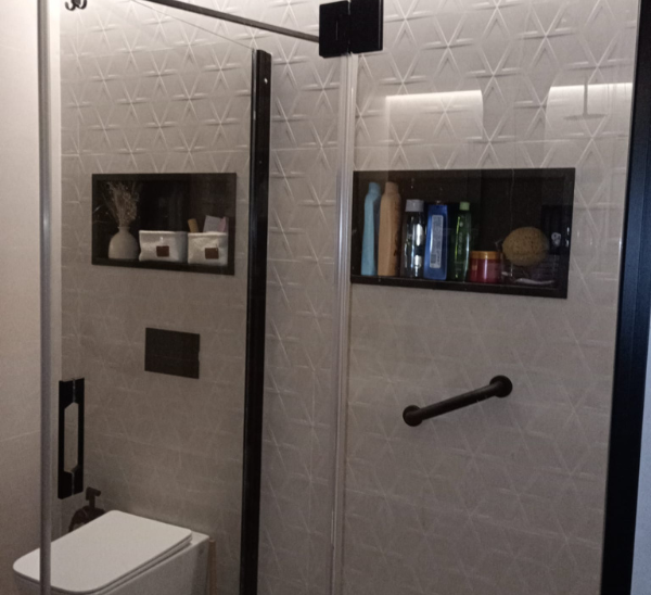 Añadimos hornacinas en la ducha y zona del inodoro para optimizar el almacenamiento y mantener un espacio organizado y funcional